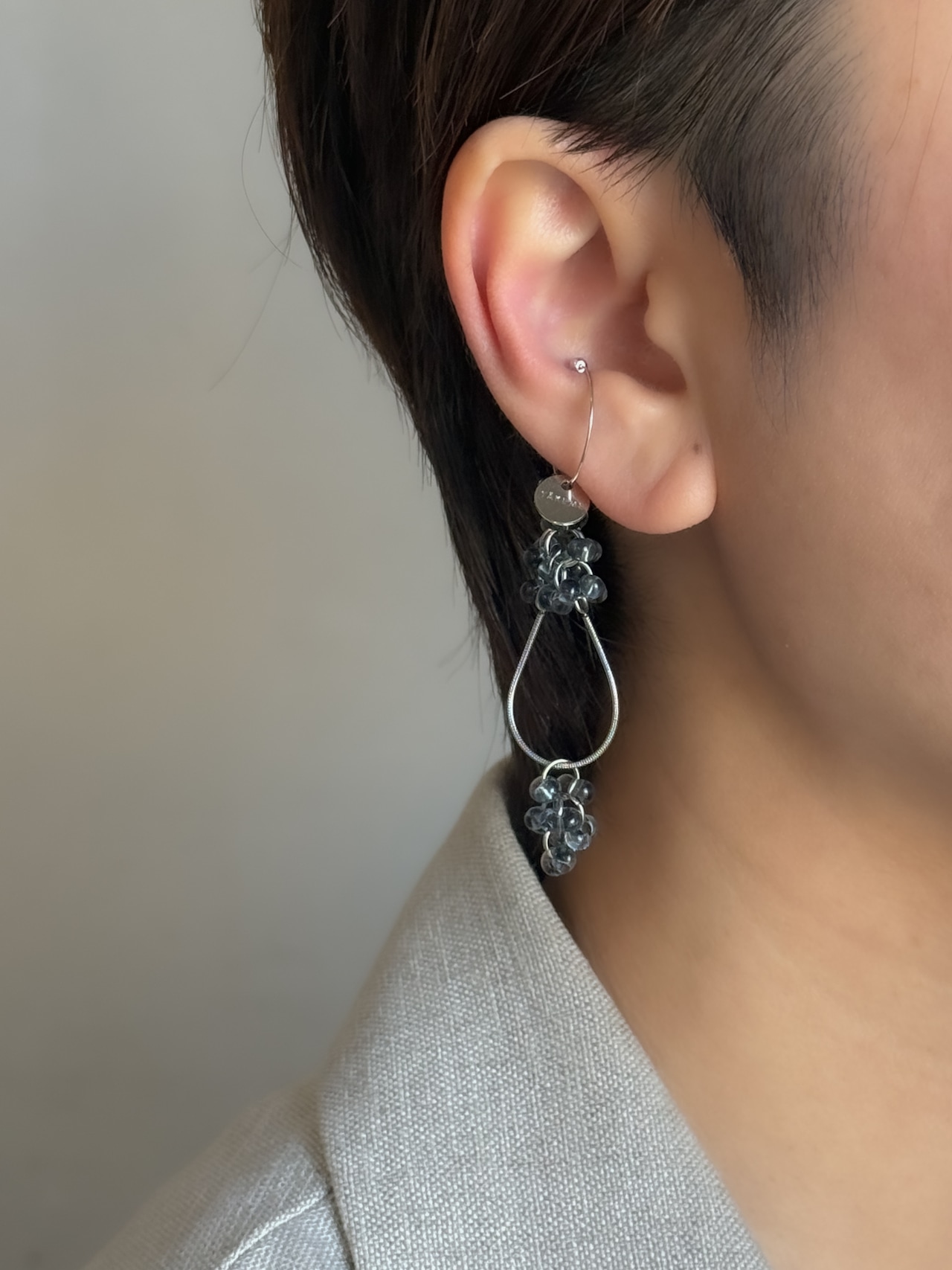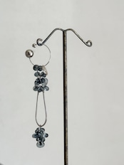 透け感のあるガラスビーズは、抜け感をプラス。ネイビーと黒を混ぜたような、雰囲気のあるカラーで差をつけて!シルバーチェーンはステンレス製で汗水に強く長くお楽しみいただけます。両耳でイヤリングとして楽しみたい方にもおすすめ◎